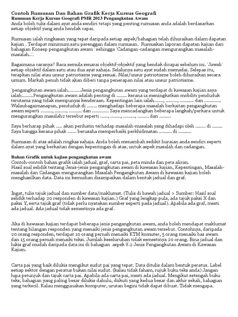 Berikut adalah contoh kerja kursus geografi pt3 sistem pengangkutan yang dapat. Terdapat 3 bahagian dalam aspek ini iaitu (1)huraian kawasan kajian, . Bboorraanngg ssooaall sseelliiddiikk kerja kursus geografi pmr 2011 sekolah .